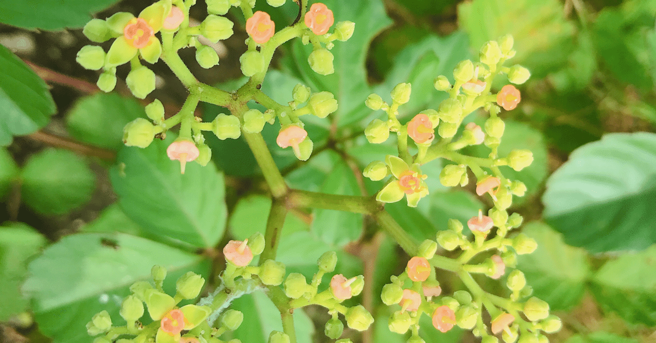 ヤブガラシ 藪枯らし 緑とオレンジとピンクの粒々の花 優しい雨